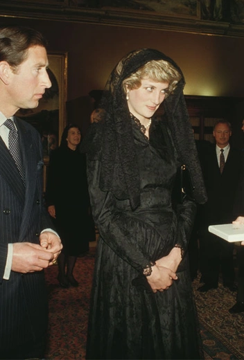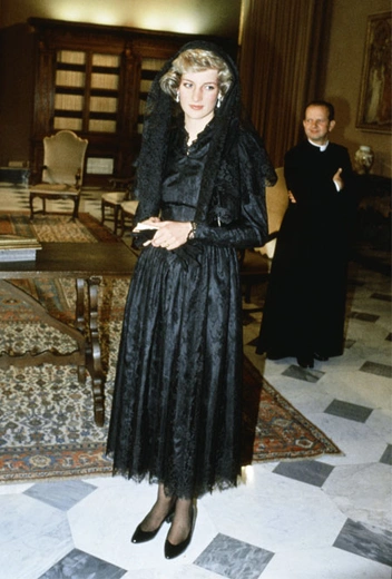 Нет, это не похороны и не рекламная кампания Dolce& Gabbana. Мрачный кружевной наряды от Кэтрин Уолкер Диана примерила для встречи с Папой Иоанном Павлом II в Ватикане. Образ был разработан по всем канонам католической религии: женщины, которых принимает Папа Римский, должны быть одеты в наряд черного цвета с длинными рукавами. При этом их головы необходимо покрыть вуалью (или мантильей). И хотя Диана выполнила все необходимые требования, ей это удалось намного менее удачно, чем другим влиятельным особам, отправляющимся на встречу с Папой.