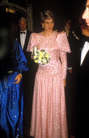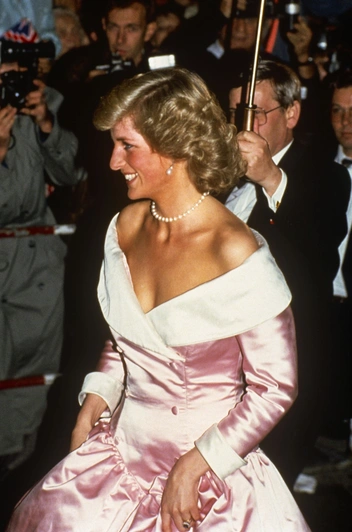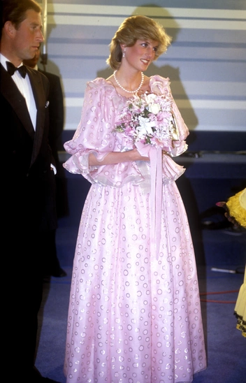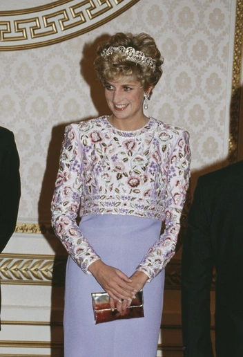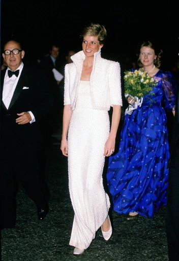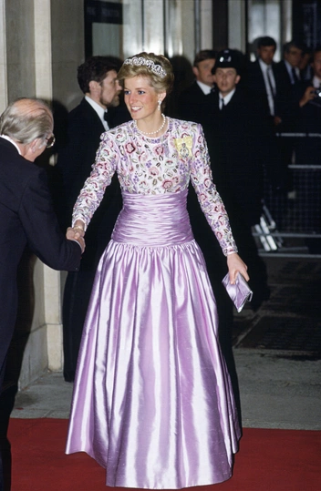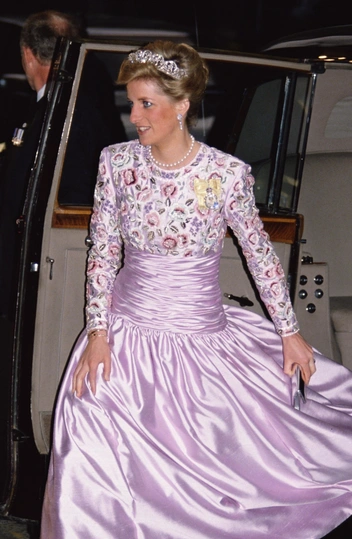 Тот случай, когда Диана понимала свой титул принцессы слишком буквально. Государственные банкеты — отличный повод впечатлить публику роскошными вечерними образами. Однако нередко Диана выбирала нарочито помпезные, пышные платья, которые делали из нее куклу. Типичный пример — шелковое лавандовое платье с бисером от Catherine Walker.