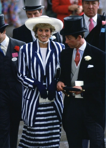 Темно-синяя и белая полоска всегда выглядит изысканно и, конечно же, Диана это прекрасно знала. На скачках Royal Ascot она примерила образ от Roland Klein с плиссированной юбкой и объемным блейзером, дополнив наряд блузкой Chanel, белой широкополой шляпой и сумочкой в тон. Жемчужное колье, которое она часто носила на публике, было подарком на ее шестнадцатилетие. Хотя леди Ди, безусловно, выделялась в толпе, иногда контрастная полоска может сыграть злую шутку: наряд принцессы выглядел чересчур броско.