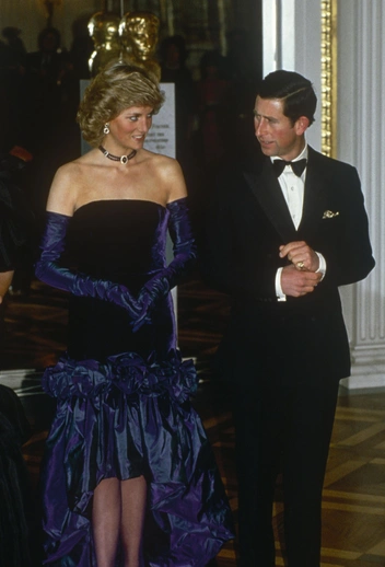 Еще один эксперимент Дианы с двумя излюбленными аксессуарами королевского дресс-кода — перчатками и колготками. Для визита в Национальный театр Мюнхена Диана выбрала бархатное платье от Кэтрин Уолкер с пышной переливающейся юбкой с драпировками. Погоня за актуальностью и креативностью ни к чему хорошему не привела — образ с сиреневыми колготками, длинными перчатками и чокером в разных оттенках фиолетового выглядел довольно несуразно.