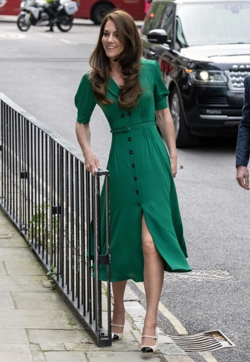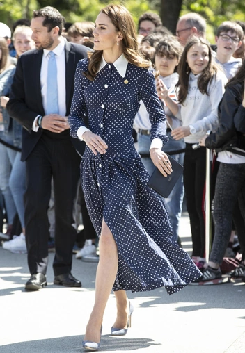 Например, чайное платье Suzannah эффектного зеленого оттенка за три тысячи фунтов стерлингов обладает как раз таким разрезом (и количеством пуговиц), который заканчивается чуть выше колена, что позволило Уэльской продемонстрировать свои стройные ноги. Кейт надела его во время посещения Центра Анны Фрейд на прошлой неделе. До этого будущая королева уже делала выбор в пользу подобных фасонов — и тоже теплым майским днем. Герцогиня Кембриджская продемонстрировала схожий вырез во время выставки D-Day в Блетчли-парке. Кейт выглядела готовой к весне в синем платье Alessandra Rich средней длины в мелкий горох за 1750 фунтов.