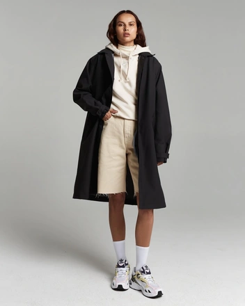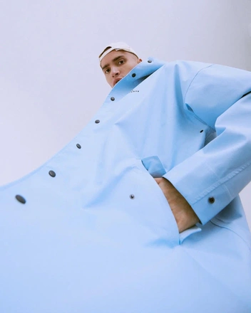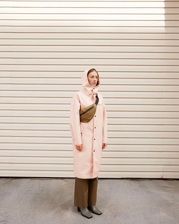 Мы уже хорошо знакомы со своим покупателем. Мы знаем, что не всем нравится оверсайз и нанесения в виде принтов и логотипов. Поэтому решили сделать консервативный городской макинтош. Макинтош — это элемент верхней одежды с историей и, как мы уже упоминали, c определенными канонами кроя. Прямой силуэт, отгибной воротник. Единственное, в чем мы нарушаем канон, это в том, что добавляем отстегивающийся капюшон.