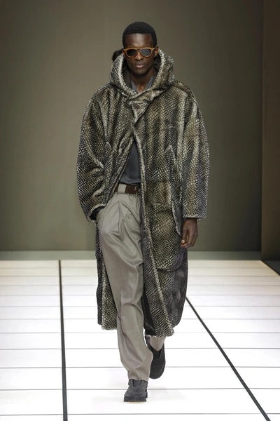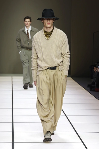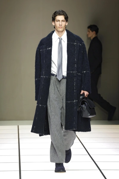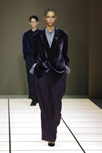 Внимания также заслуживает и цветовая гамма коллекции. Армани в каждом своем шоу строго придерживался любимых оттенков: серого и песочного, вариаций синего от василькового до цвета ночного неба, нейтрально-зеленых тонов и, конечно, фиолетового. И в новом шоу дизайнер, теперь исполняющий обязанности без руководства своего творческого партнера, полностью последовал этим заветам (читайте также: Из подмастерья в короли: биография великого Джорджо Армани).