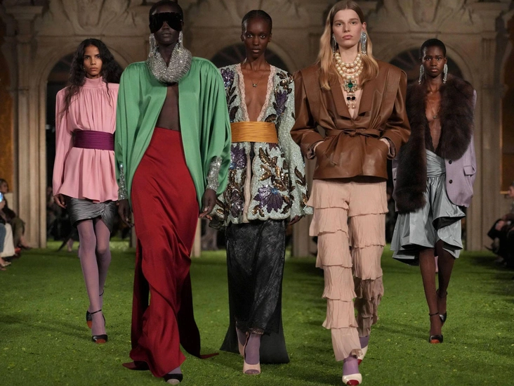 Алессандро использует свои фирменные оттенки, получившие глубину под стать осеннему сезону. Нежный розовый у него становится насыщеннее, сочетается одновременно с горчичным, королевским синим, изумрудным, сливовым. Большое внимание он уделяет и текстурам: миксует излюбленные пайетки с мехом, плиссированным шелком, расшитым шифоном, фатином и трикотажем. В общем, делает именно то, за что его так сильно любили еще в Gucci — вносит праздность в нашу повседневность.
