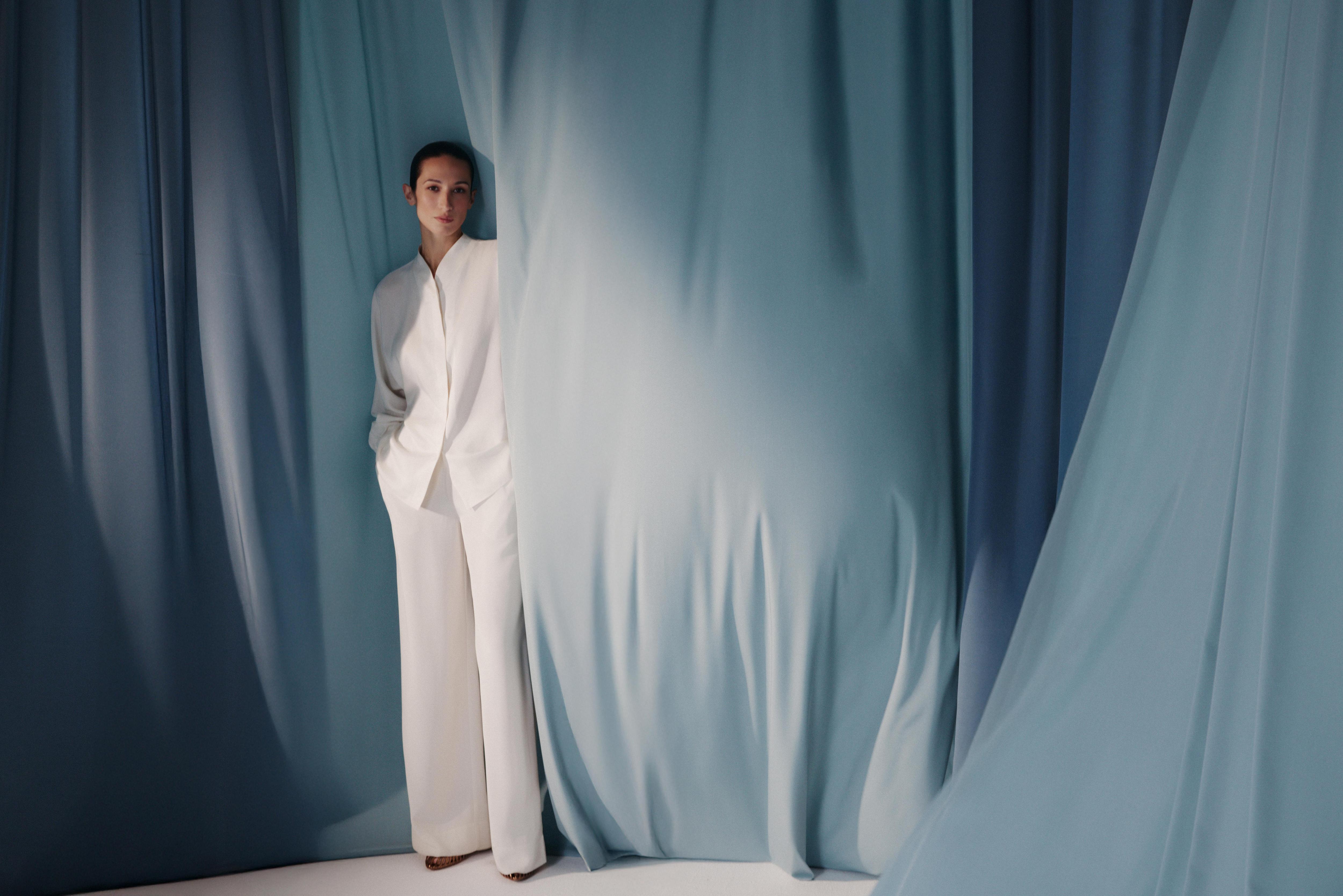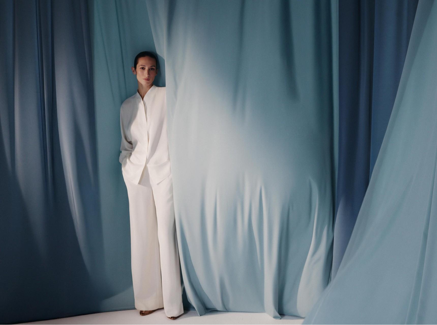 Среди моделей — блузка с высоким воротником и свободные брюки, которые хорошо держат форму. Лаконичные и простые, оба изделия создают комфортный закрытый силуэт без лишних деталей. Для комплекта Alice Blue был выбран шелк серо-голубого оттенка, напоминающий мираж в жаркой пустыне. Этот материал приятно скользит по коже, создавая ощущение легкой прохлады и невесомости. Комплект также доступен в цвете Ecru — это оттенок необработанного шелка, близкий к молочному. Такие образы выглядят торжественно, но не перегружено, поэтому их можно стилизовать как для дневных, так и для вечерних мероприятий.