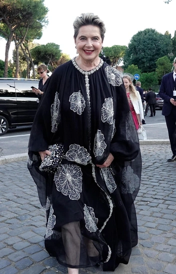 Вскоре на территории Форума показалась и итальянская кинодива Изабелла Росселини. Она выбрала объемное летящее платье с вышивкой в виде белых цветов и окантовкой из крупных кристаллов.