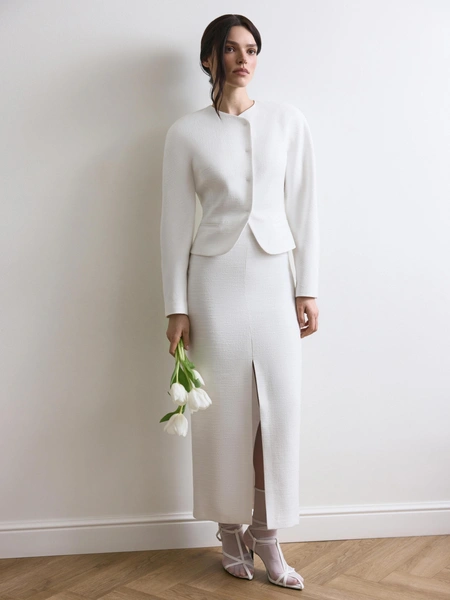 Если в вашем гардеробе большую часть занимают жакеты, то белоснежный вариант SOLENE O-силуэта из фактурного твида точно стоит рассмотреть для покупки. В дуэте с макси-юбкой, дополненной изящным разрезом, такой образ оживет и обретет тонкую женственность и строгость одновременно.