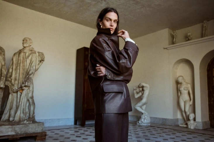 Отдельный акцент дизайнеры сделали на моделях из натуральной кожи: жакет, брюки, бермуды, юбка и платье с открытой спиной. Здесь кожа выступает не как трендовый элемент, а как символ статуса, решительности и уверенности.