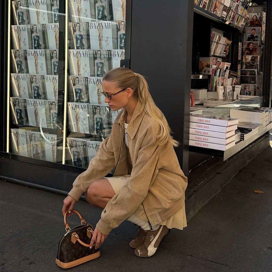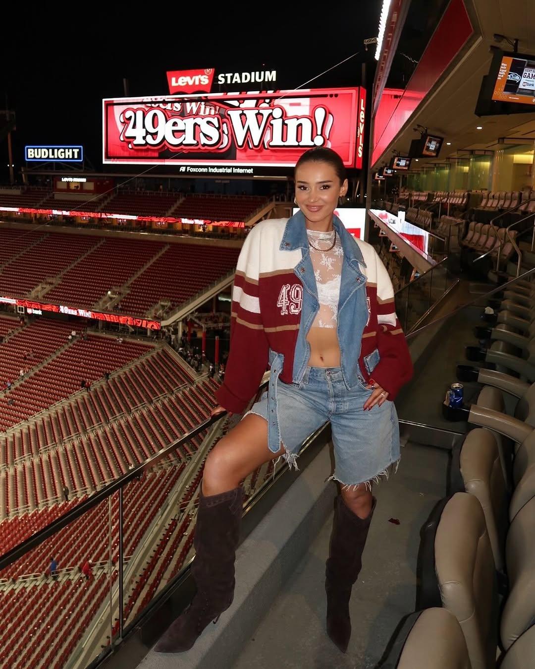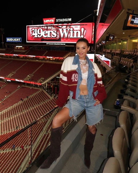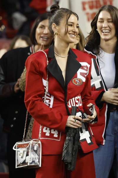 Супруга защитника San Francisco 49ers Кайла Ющика прославилась не только как его жена, но и как дизайнер. Талант превращать старый футбольный мерч в стильные вещи она воплотила в собственном бренде Designs By Kristen, который предлагает уникальную одежду из переработанной атрибутики. Бренд Кристен взорвал интернет, когда Тейлор Свифт появилась в изготовленной на заказ куртке от Ющик. Вскоре после этого Кристен заключила лицензионное соглашение с NFL, а ее клиентская база пополнилась такими звездами, как Симона Байлс и Оливия Калпо. Впрочем, Кристен сама по себе лучшая реклама бренда: ее часто можно увидеть на трибунах в стилизованной одежде с символикой команды, будь то корсетная футболка, гоночная куртка из лоскутного трикотажа или даже лыжный костюм с меховой отделкой (читайте также: Панама на завязках, меховая шапка и еще 8 вариантов головных уборов на весну 2025).