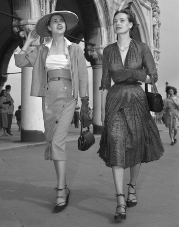 В качестве главного примера взглянем на стиль New Look от Кристиан Диор. Элегантная, женственная, романтичная с тонкой талией, узкими плечами и изящными бедрами — такой была «идеальная женщина» пятидесятых годов прошлого века. Образ женственной матери и жены всецело поддерживало правительство Соединенных Штатов, с целью показать, как женщина на ура справляется с возложенными на нее обязанностями и выглядит при этом сногсшибательно, пока мужчина успешно выполняет роль добытчика в семье.