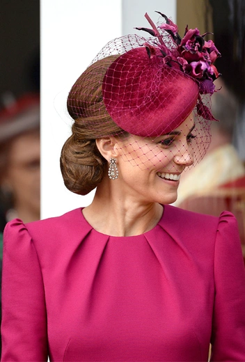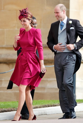 Этой же стратегией воспользовалась и герцогиня Кейт на свадьбе принцессы Евгении и Джека Бруксбэнка. Для торжества она выбрала малиновое платье от Alexander McQueen и шляпу в тон.