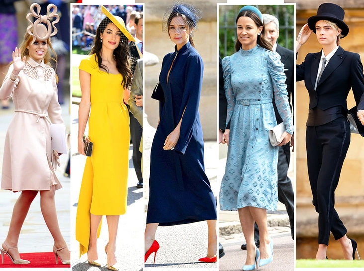 Пожалуй, самым популярным нарядом на свадьбе Уильяма и Кейт были костюмы с атласной юбкой — и это, конечно, не требование протокола, а, скорее, дань довольно специфическим трендам 2010-х (читайте также: 10 причин, почему 2010-е — худшее время в истории моды). В этом случае более универсальными и вневременным решением были бы лаконичные платья-футляры без декора или варианты с атласными юбками-миди — варианты, которых мы в изобилии увидели уже на торжестве Меган и Гарри.