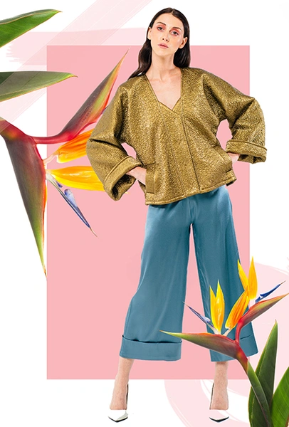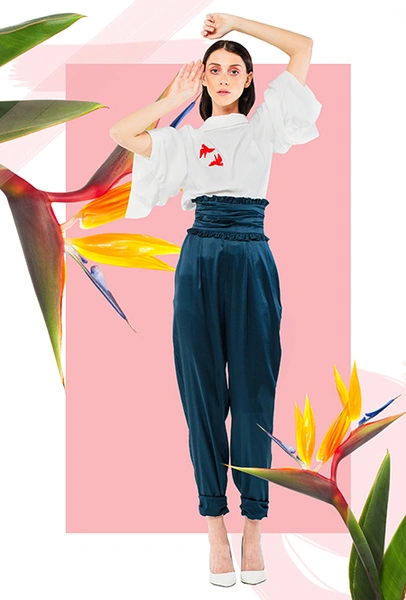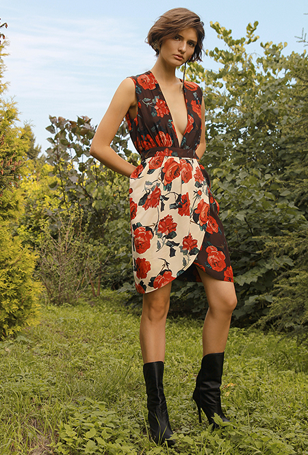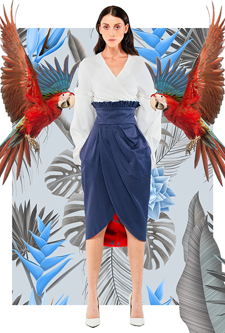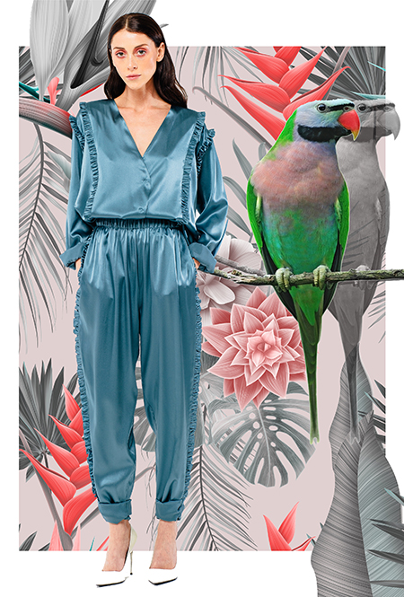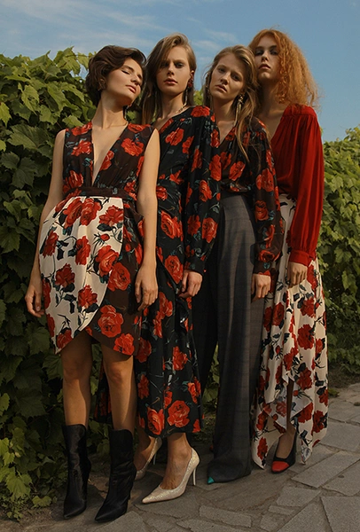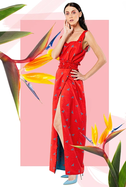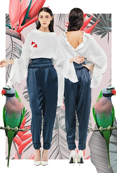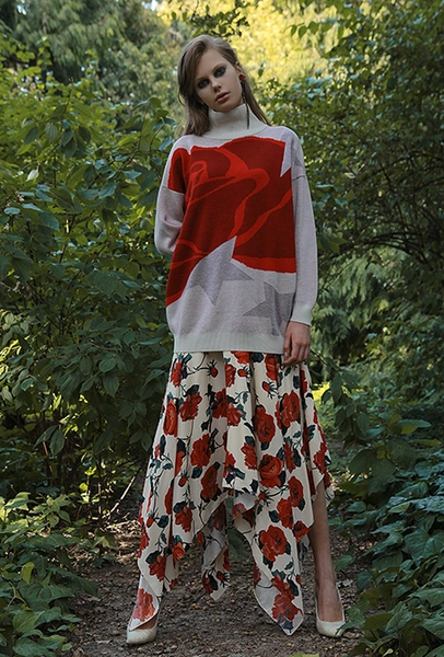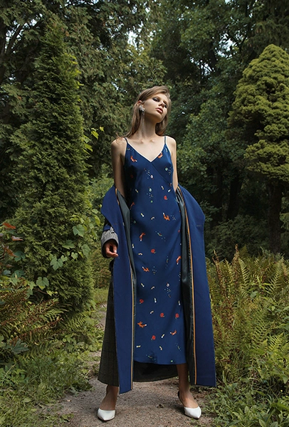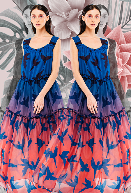 Трехлетний бренд Kochetkova попал в наш обзор благодаря интересной работе с цветом и неклассическим (в хорошем смысле этого слова) силуэтам. Главной темой любой коллекции становится изображение петуха-кочета, однако в будущем сезоне его сменяет другая птица — попугай, красующийся на фоне предзакатного неба. И если все макси-платья будут именно такими — мы будем только рады.