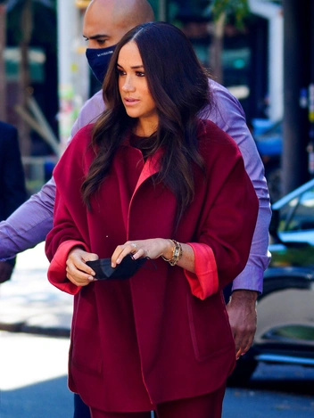 На Меган был снова был тотал-лук, но уже в бордовом цвете. Он состоял из кашемирового пальто Loro Piana за 5840 долларов с яркой подкладкой и отделкой на карманах, широких брюк того же бренда за 1685 долларов, топа Loro Piana из кашемира и шелка за 1050 долларов и ремня той же марки за 775 долларов. С ними соседствовали остроносые бордовые туфли Manolo Blahnik за 695 долларов, черный кошелек Bottega Veneta за 790 долларов, черная маска и все те же дорогостоящие украшения Cartier, Jennifer Meyer и Birks. Этот образ вызвал сравнения со стилем одной из первых леди США (читайте также: Точный расчет: зачем герцогиня Меган копирует стиль одной из самых популярных Первых леди).