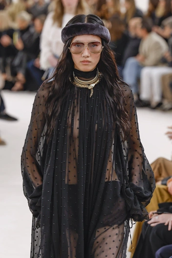 На показе Chloe сезона 24/25 как раз был представлен образ с ободком в стиле бохо. Как ни странно, а ободок с мехом удачно смотрится с летящими тканями и нежными оттенками. Так что можно сочетать этот аксессуар с платьем с оборками ниже колена, распущенными и слегка завитыми локонами, или одеждой с бохо-принтами (цветы, восточные мотивы, кружево).