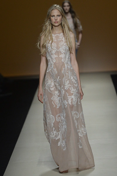 Для столь важного мероприятия Эванджелин Лилли выбрала кружевное платье из коллекции Alberta Ferretti весна-лето 2015. Канадская актриса также добавила клатч бронзово-бежевого цвета с абстрактным узором и массивное кольцо.