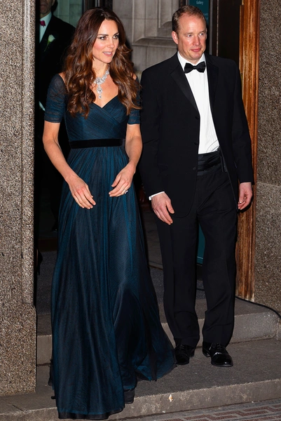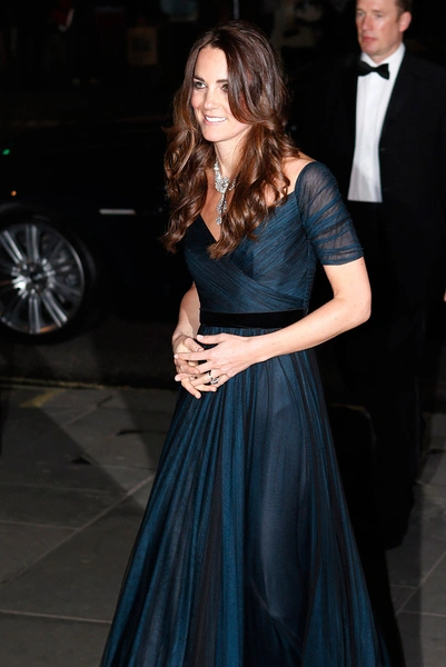 Для события она выбрала изумрудное платье Jenny Packham, дополнив его бриллиантовым колье из коллекции низама Хайдарабада, которое королева Великобритании подарила ей в день свадьбы. Перед помолвкой Елизаветы II низам сказал будущей правительнице выбрать украшения из коллекции Cartier. Королева выбрала тиару и ожерелье, основанные на английской розе. Колье состоит из длинной цепочки из 38 бриллиантов, в его центре 13 бриллиантов изумрудной огранки в форме грушевидной капли. Именно это историческое ожерелье Елизавета II и преподнесла Кейт Миддлтон.