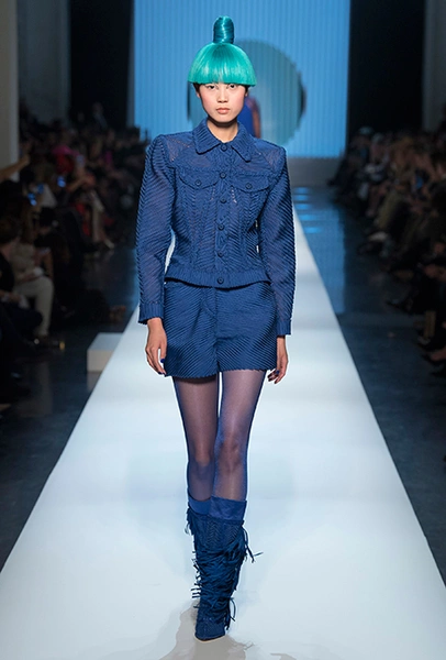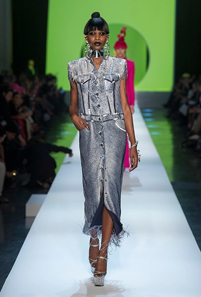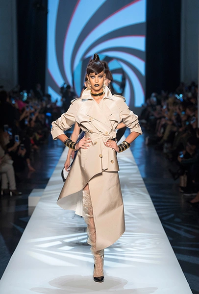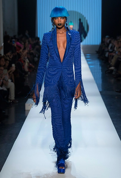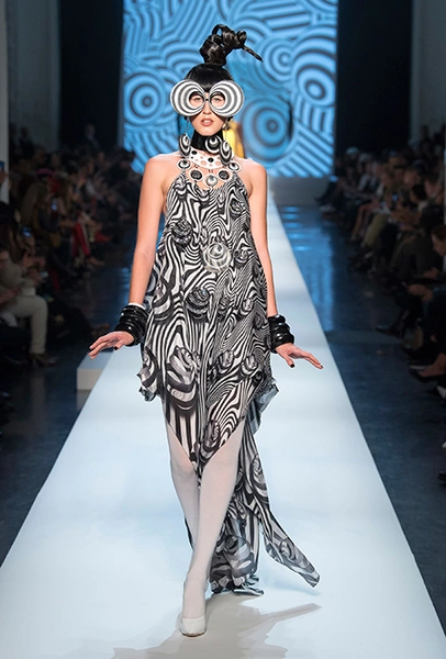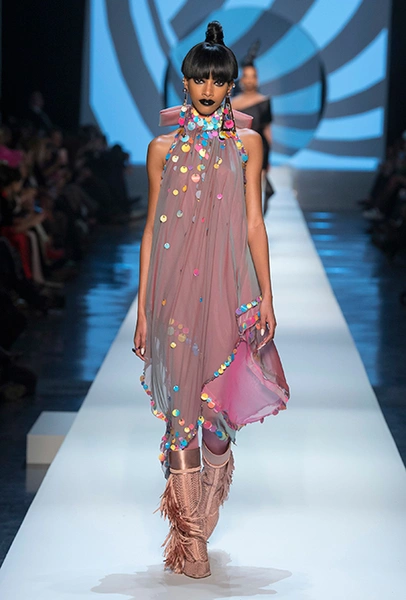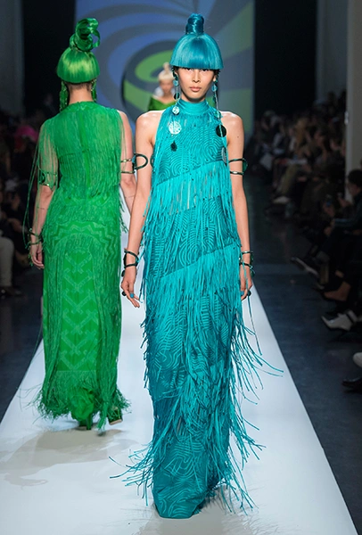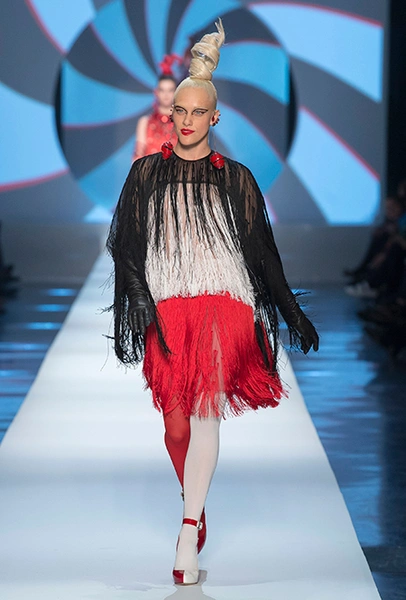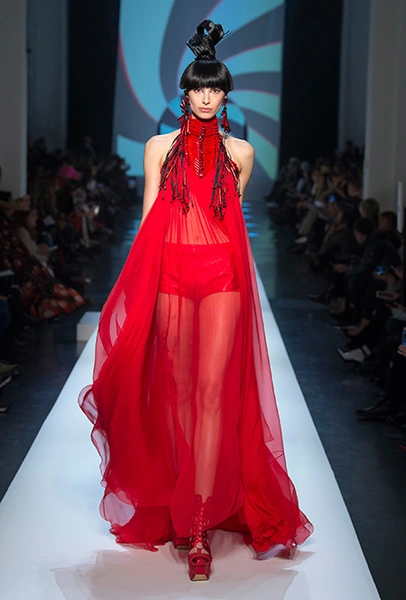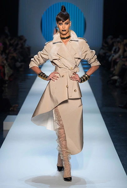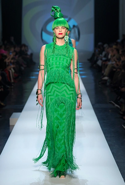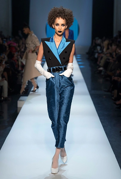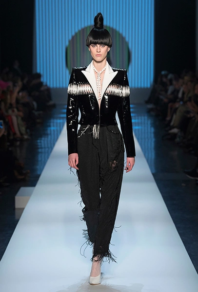 В целом, типичная героиня Готье – женщина, живущая условно между небом и землей. Она, вроде бы, вполне реальная и осязаемая, но, в то же время, ощущает сильную связь с космосом, словно тянется ввысь – отсюда давняя любовь метра к удлиненным силуэтам – их он «вытягивает» то за счет головных уборов, вроде высоких шапок с помпонами, как в прошлой кутюрной коллекции, то за счет причесок. На этот раз модели носили на подиуме высокие сложные пучки, сооруженные когда на настоящих волосах, а когда на кислотного цвета париках.