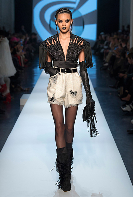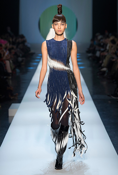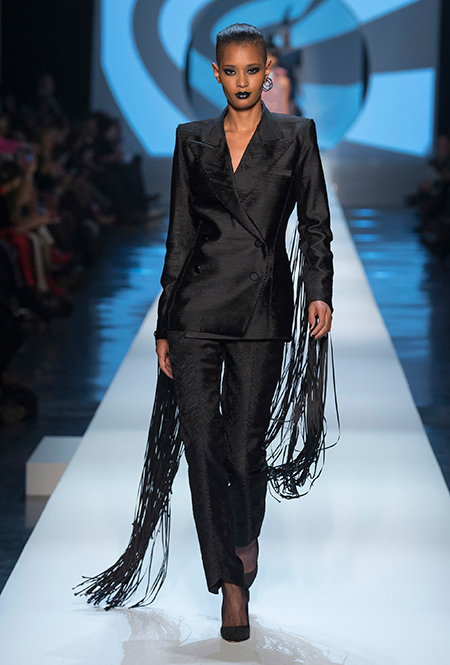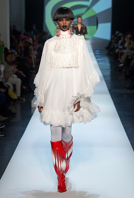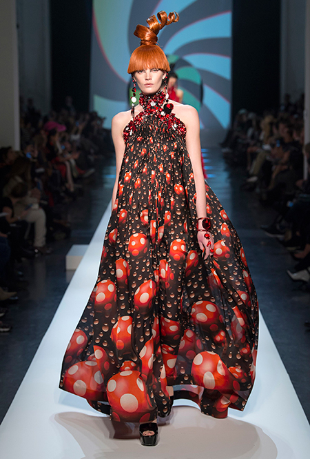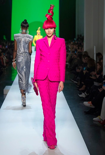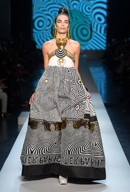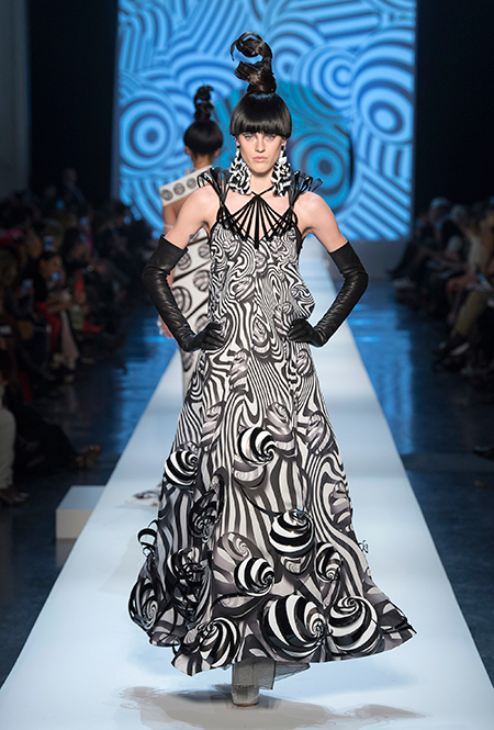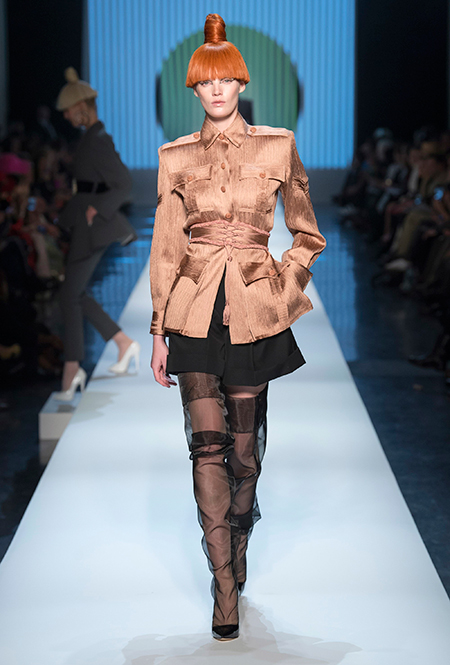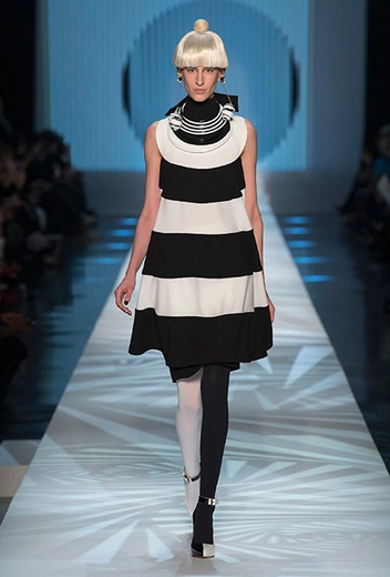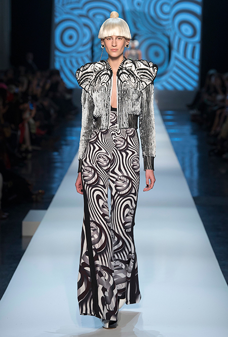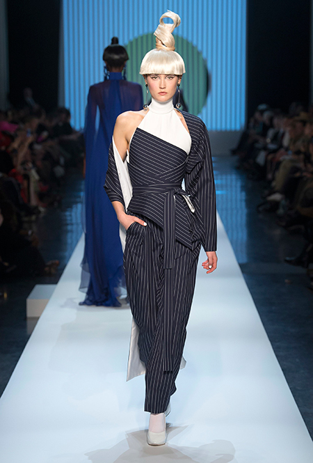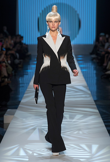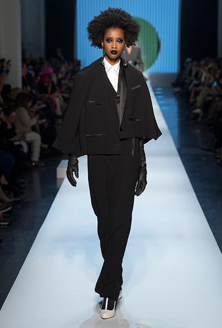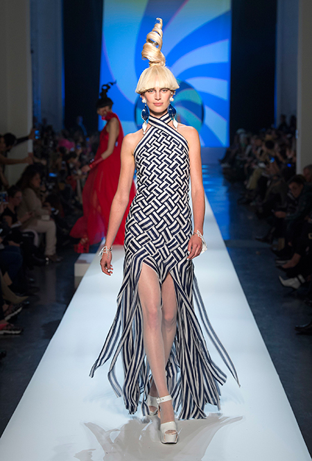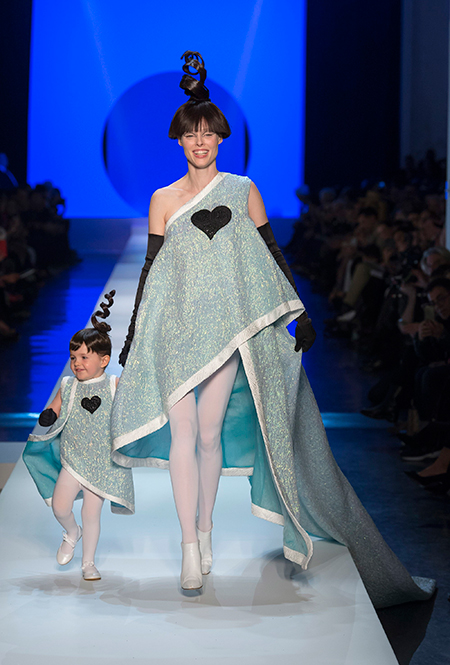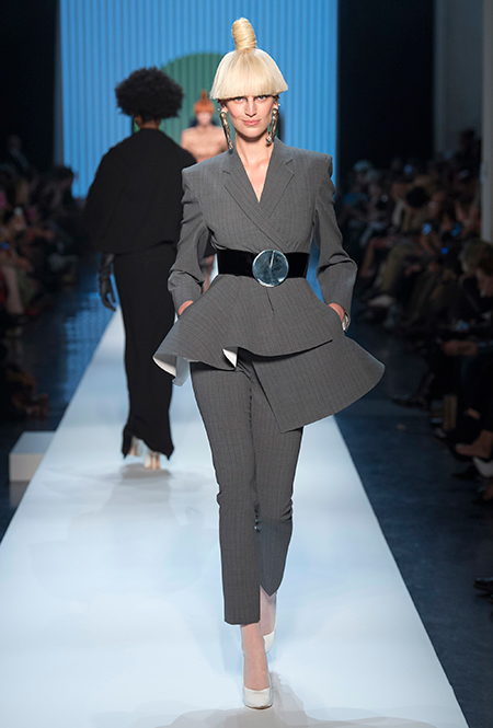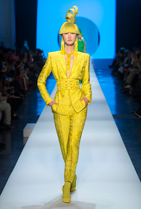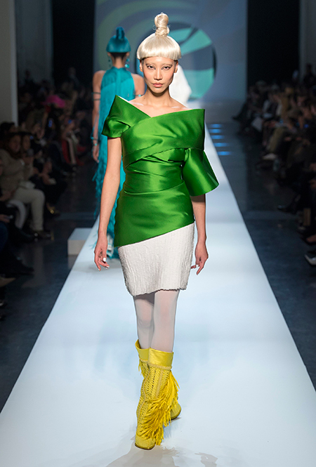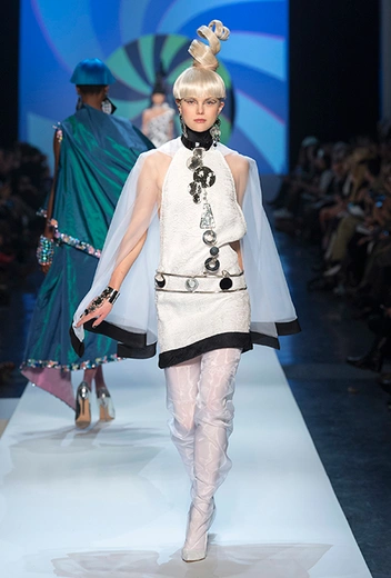 В целом, типичная героиня Готье – женщина, живущая условно между небом и землей. Она, вроде бы, вполне реальная и осязаемая, но, в то же время, ощущает сильную связь с космосом, словно тянется ввысь – отсюда давняя любовь метра к удлиненным силуэтам – их он «вытягивает» то за счет головных уборов, вроде высоких шапок с помпонами, как в прошлой кутюрной коллекции, то за счет причесок. На этот раз модели носили на подиуме высокие сложные пучки, сооруженные когда на настоящих волосах, а когда на кислотного цвета париках.