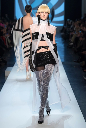 Показ Jean Paul Gaultier Couture SS18 запомнился еще и тем, что в первом ряду сидел собственной персоной Пьер Карден – еще одна легенда французской моды. Но если вещи Кардена – олицетворение духа 60-х, то Готье, сколько бы ни прошло лет, никогда не перестанет быть воплощением 90-х. Именно это десятилетие вспоминаются в первую очередь, стоит увидеть хотя бы несколько образов из новой коллекции. А если точнее, то на ум приходят кадры из культового фильма той эпохи - «Пятого элемента». Того самого, для которого Готье создавал костюмы. Картина о пришельцах из космоса – что может быть более подходящим для «космического» JPG?