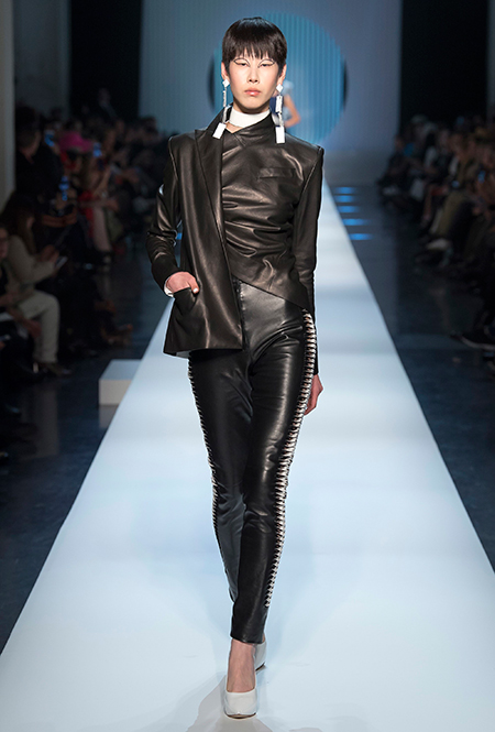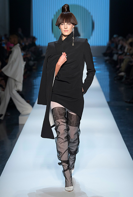 Толику футуристической эксцентрики вносят аксессуары – некоторые образы дополнены высокими, до середины бедра полупрозрачными ботфортам-чулками, надетыми прямо на туфли.