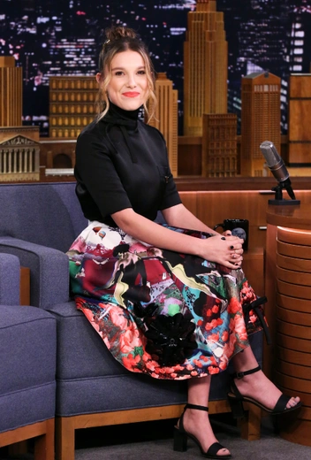 На огромные каблуки Милли тоже ставили с юного возраста. Ботильоны на платформе, мини-юбка, топ и дерзкие очки — такой образ уже давно стали привычным. И если изящные туфли на каблуках kitten heels делают образы актрисы, скорее, очаровательными, то лодочки на высокой шпильке и массивные лоферы на платформе нередко выглядят чересчур серьезно, дерзко и зрело.