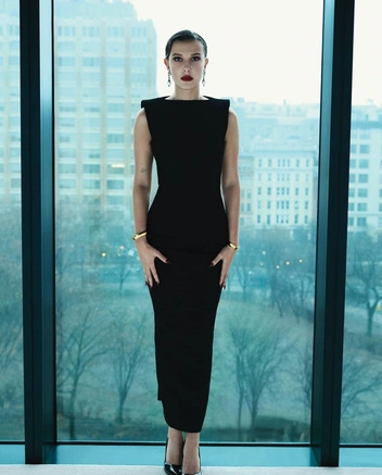 В кадре звезда «Очень странных дел» позирует в строгих платьях-футлярах, остроносых туфлях на шпильках и сложных корсетах. Волосы убраны назад, губы покрыты темно-вишневой помадой, на глазах драматичный smokey. Она вновь выглядит старше своих лет — но так теперь она хочет выглядеть сама, без советов стилистов.