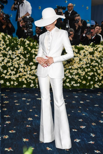 Актриса блистала на голубой дорожке модного «Оскара» в белоснежном костюме Louis Vuitton. Приталенный блейзер и расклешенные брюки она сочетала с рубашкой, жилетом и галстуком в тон. Также при детальном рассмотрении становится ясно, что на спине Зендеи прикреплена маленькая серебряная змейка. Эта деталь, наряду с ее украшениями, — дань уважения бренду Bulgari, с которым звезда сотрудничает уже много лет.