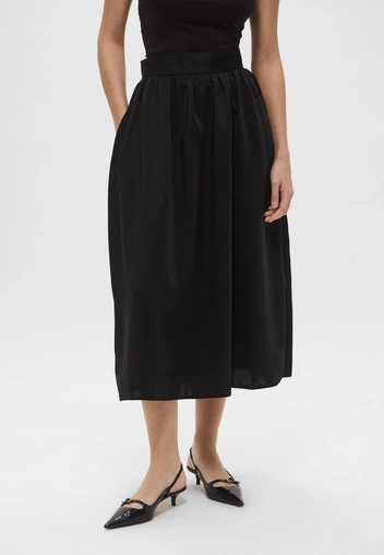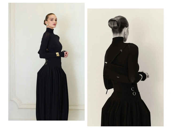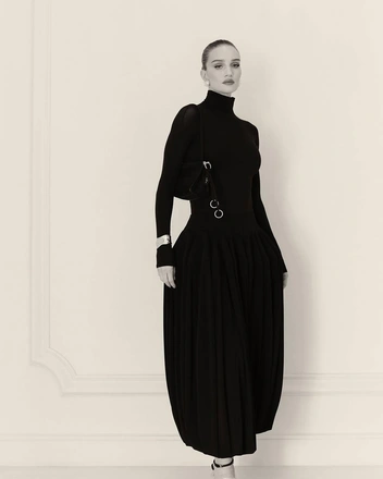 В своих социальных сетях модель поделилась снимками из рекламной компании бренда. На них она позирует в полностью черном аутфите: тонкой трикотажной водолазке и необычной юбке — одновременно плиссированной, но напоминающей бутон тюльпана по своей форме. Именно такая вещь может заменить собой десяток других, ведь она одновременно абсолютно универсальна и, при этом, готова стать главным акцентом в наряде.