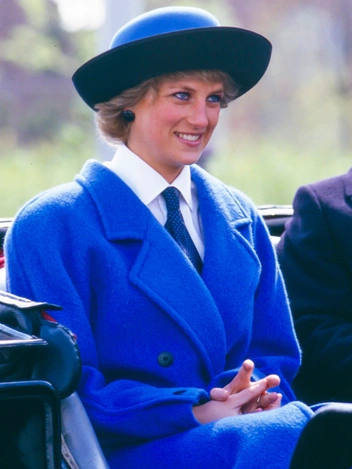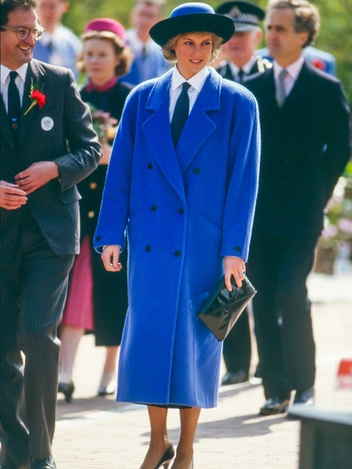 Пожалуй, никакой другой цвет не шел принцессе Диане так, как синий. Он делал цвет ее глаз ярче, перекликался с сапфиром на помолвочном кольце и заставлял Ди выглядеть собранно, а иногда даже строго. В арсенале Уэльской было немало объемных пальто цвета электрик, и эта двубортная модель отлично сочеталась с белоснежной сорочкой и галстуком. Смягчали картину элегантные лодочки и шляпа.