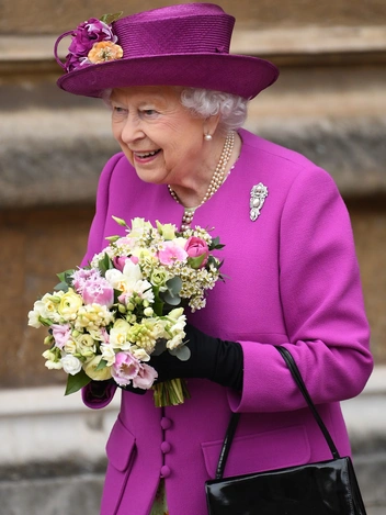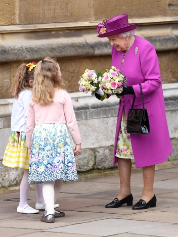 Фиолетовый появляется в гардеробе монарха чуть реже, чем розовый, но смотрится не менее эффектно, особенно если под фиолетовым пальто красуется платье с цветочным принтом, а в руках монарх держит букет как на этих пасхальных снимках.