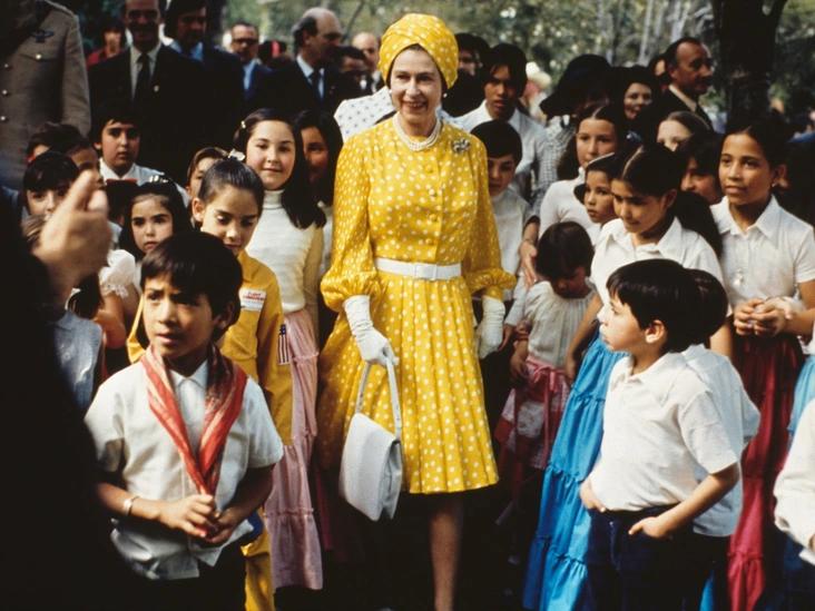 Жизнерадостный желтый вообще считается одним из любимых оттенков Ее Величества. В 1975 году она предстала перед жителями Мексики в прекрасном желтом платье в горох и тюрбане из той же ткани. Их дополнили белые перчатки, сумочка, пояс и жемчужное колье.