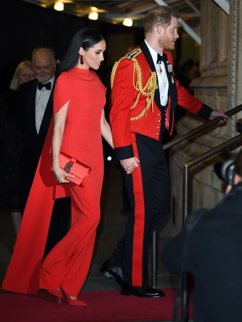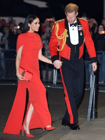 Немного позже эксперимент с актуальным вечерним костюмом в тотальном красном цвете повторила герцогиня Сассекская, завершая исполнение официальных королевских обязанностей на музыкальном фестивале Mountbatten Festival of Music в Королевском Альберт-Холле в марте 2020 года. На Меган было не только узкое красное платье с шлейфом и лодочки с клатчем в тон, даже ее серьги соответствовали выбранной гамме.