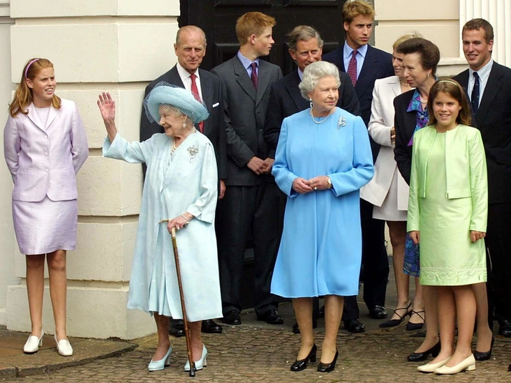 На этом снимке можно полюбоваться не только на Ее Величество и королеву-мать, традиционно отдающих предпочтение тотальным комплектам, но и на их внучек, принцесс Беатрис и Евгению, также примеривших сдержанную королевскую «униформу» ко дню рождения вдовствующей королевы в 2001 году. На сестрах комплекты из платьев и жакетов в одном цвете, дополненных тонкими ободками в тон.