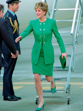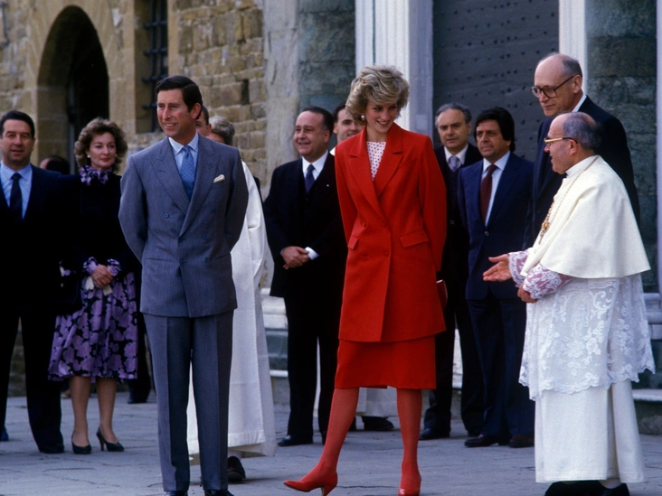 Принцесса Уэльская была отважнее многих других королевских особ в своих экспериментах с монохромом. На этом снимке она запечатлена во время визита в Италию. На принцессе не только алый костюм в топом в мелкий красный горошек и алые туфли, но и колготки в тон.