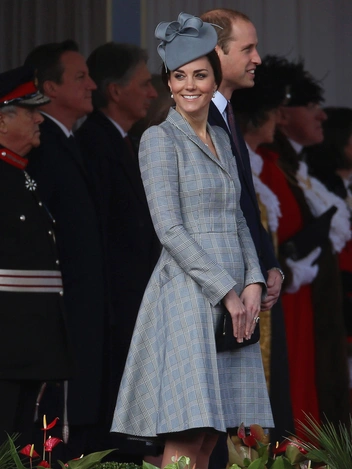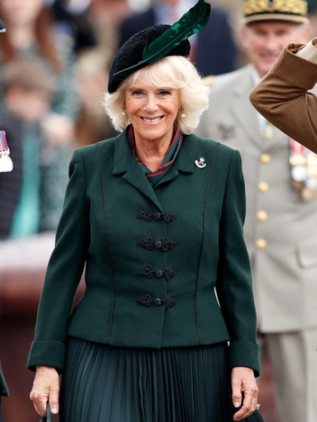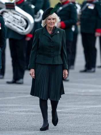 Герцогине Камилле одинаково хорошо удаются комплекты в насыщенных драгоценных оттенках и сияющих светлых тонах. В данном случае Корнуольская выступила в роли королевского полковника 4-го батальона стрелков и выбрала темно-зеленый жакет, плиссированную юбку, берет с необыкновенной красоты пером в тон и даже сумку того же цвета.
