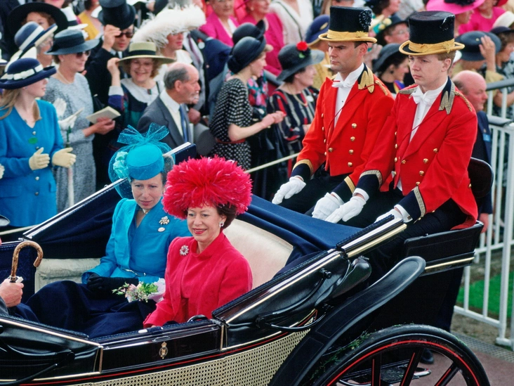 Позже Анна продолжала придерживаться синей гаммы, которая подчеркивает цвет ее глаз и сочетается с ее любимыми сапфировыми украшениями (напомним, оба помолвочных кольца королевской принцессы увенчаны сапфирами). А вот ее тетя чувствовала себя уверенно в бордовом ансамбле из летнего пальто и шляпы с перьями, перекликающемся не только с помадой Маргарет, но и с рубиновыми серьгами и брошью.