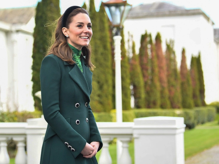 Во время визита в Ирландию в марте 2020 года герцогиня Кембриджская выдержала сразу несколько своих ансамблей в национальном ирландском цвете — зеленом. Здесь на Кейт эффектное платье с принтом и изумрудное пальто.