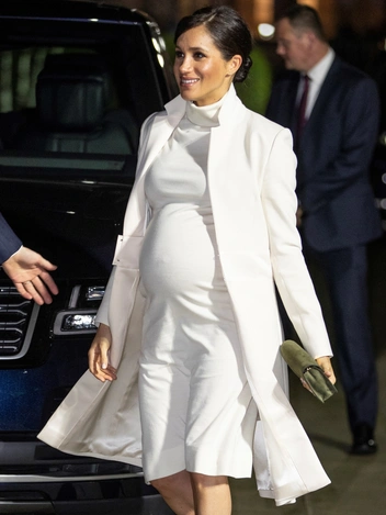 Во время первой беременности герцогиня Сассекская также продемонстрировала лаконичный белый комплект из платья и пальто, дополненный оливковым клатчем и замшевыми лодочками.