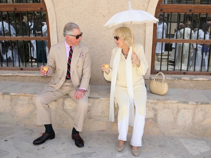 А вот герцогиня Камилла продемонстрировала умение обращаться со светлыми оттенками во время визита в Оман. Во время посещения форта Низва в восьмой день их с принцем Уэльским турне по Ближнему Востоку Коорнуольская предстала в комплекте цвета слоновой кости, дополненном бежевыми туфлями и сумкой и белым зонтом от солнца. Чарльз тоже был одет в светлый костюм.