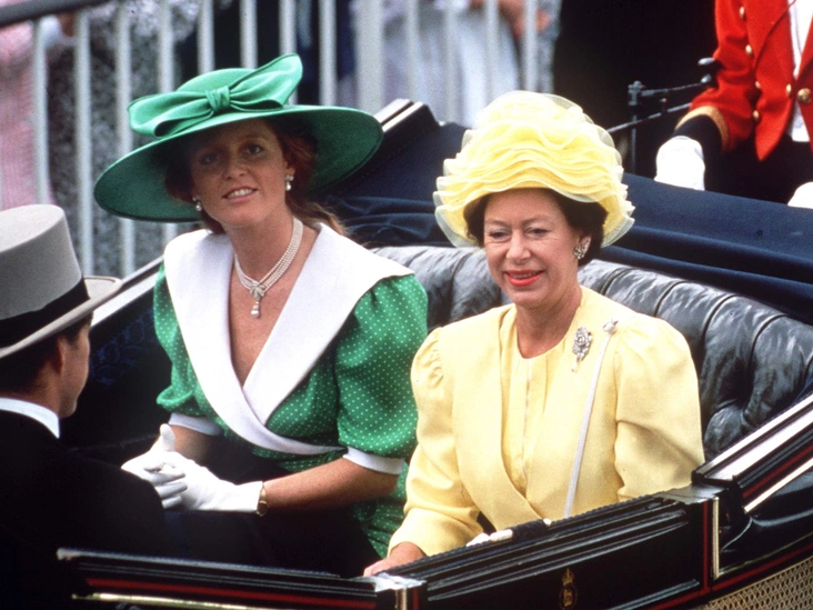 Не меньшей поклонницей зеленых комплектов слыла и рыжеволосая невестка Дианы, герцогиня Йоркская. Здесь рядом с Сарой во время скачек в Аскоте запечатлена принцесса Маргарет, облаченная в нежный желтый комплект из платья, летнего пальто и невесомой шляпы, похожей то ли на облако, то ли на десерт.