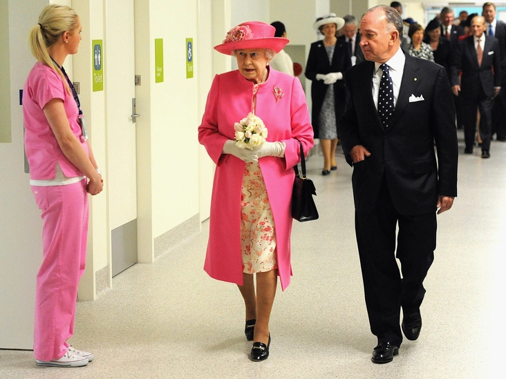Когда Елизавета II осматривала новую Королевскую детскую больницу в Мельбурне во время своего 10-дневного визита в Австралии, она выглядела свежо и мило в ансамбле из кремового платья с розовыми цветами и розовых пальто и шляпке. Форма медсестер удачно сочетались с ансамблем Ее Величества.