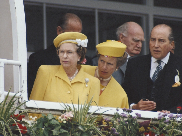 На этом снимке 1988 года королева и ее единственная дочь запечатлены на дерби в Эпсоме. На обеих желтые ансамбли, жемчужные колье и очень похожие головные уборы (на Елизавете желтая шляпа с белыми цветами, созданная Фредериком Фоксом).