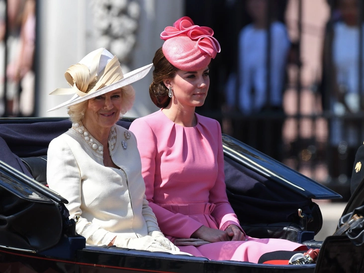Trooping the Colour — пожалуй, главный нерелигиозный праздник в календаре Виндзоров, на котором королевские дамы неизменно предстают в элегантным ансамблях и головных уборах. Герцогиня Корнуольская часто делает ставку на белый или близкие к нему оттенки, а вот Кембриджская не боится «конфетных» оттенков.
