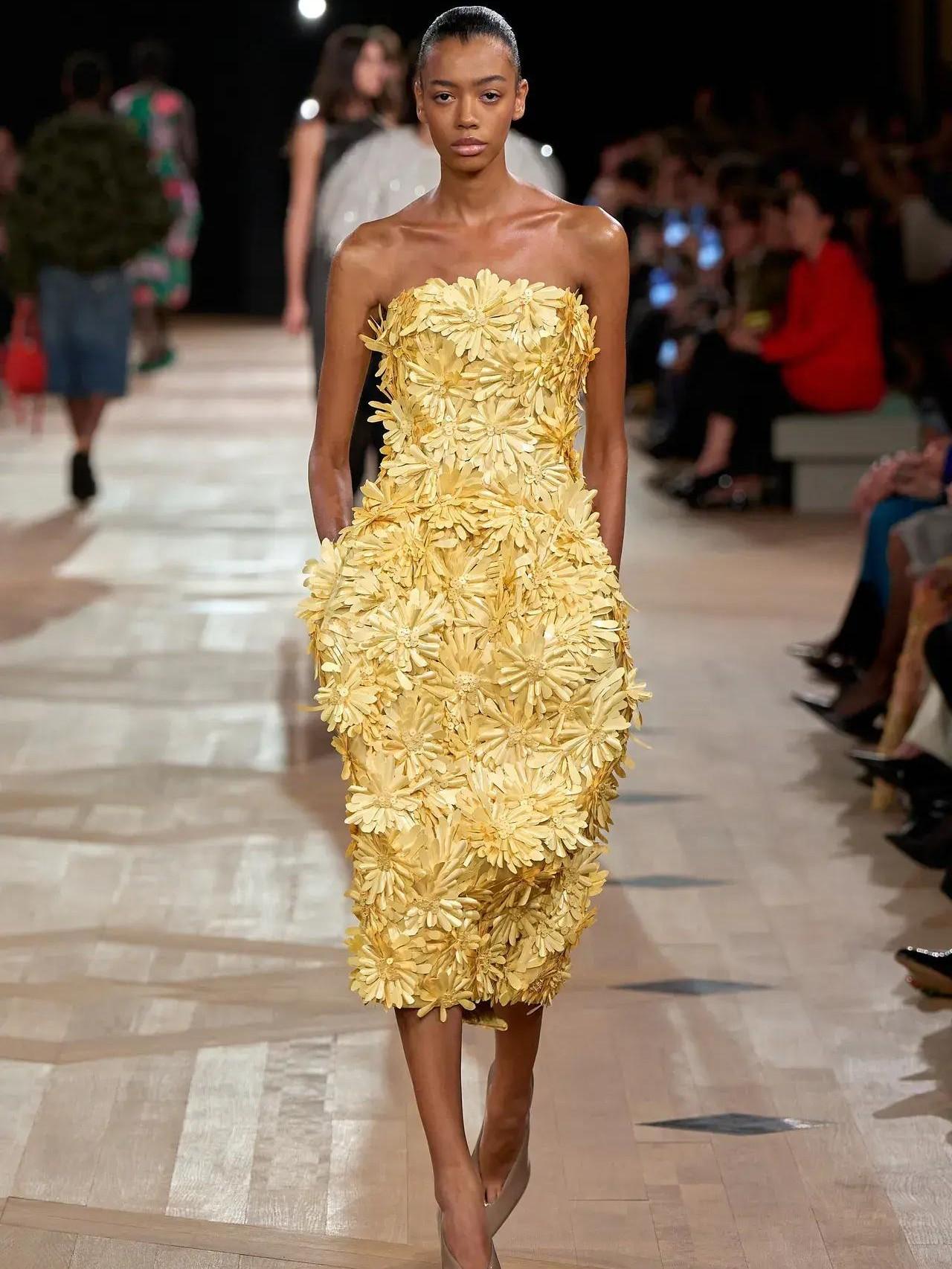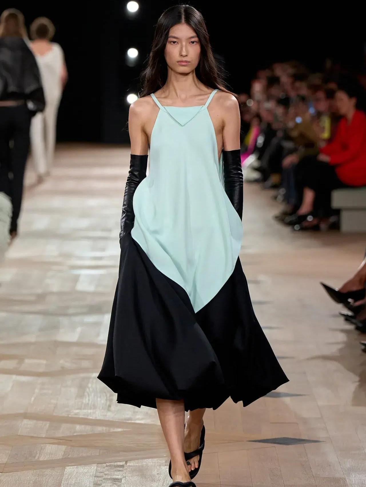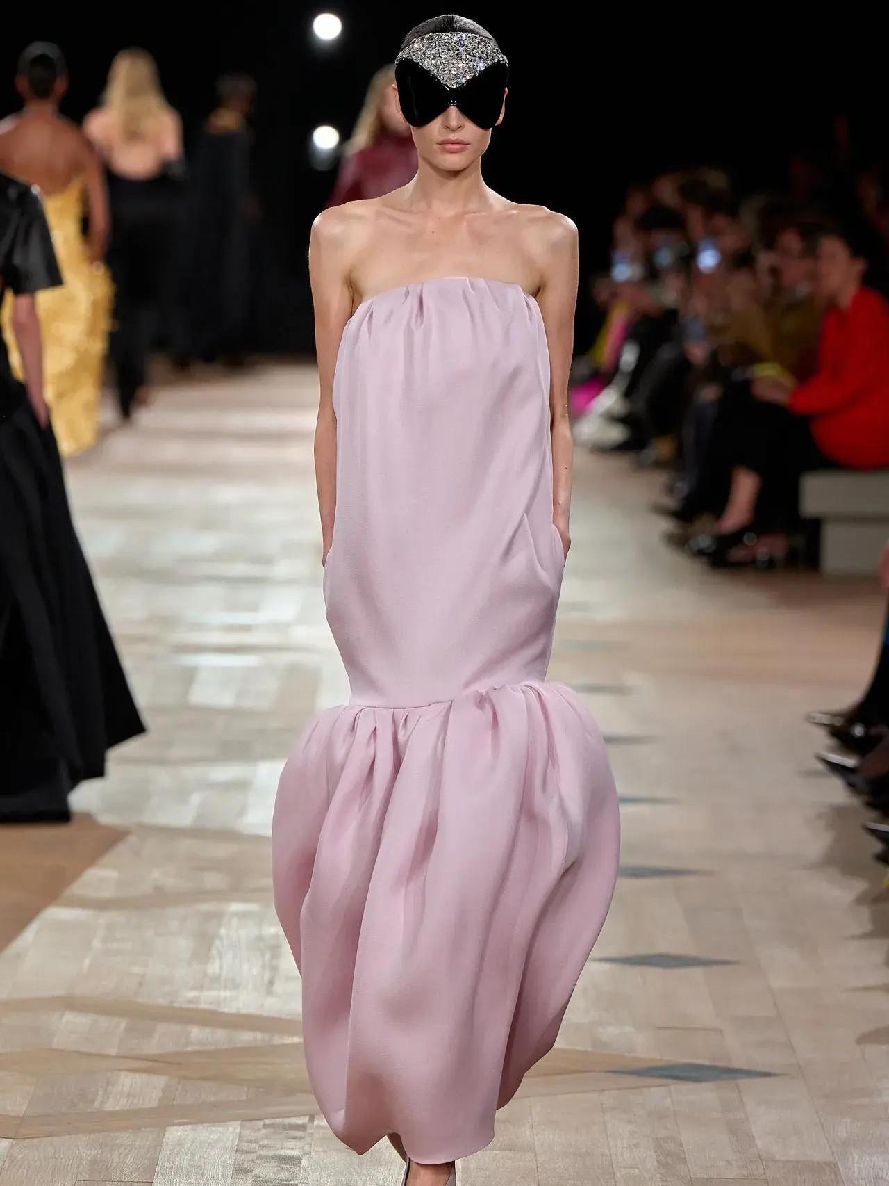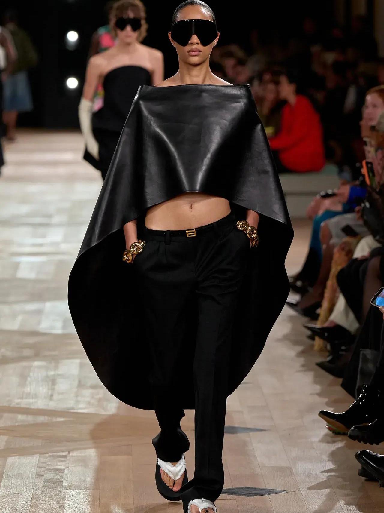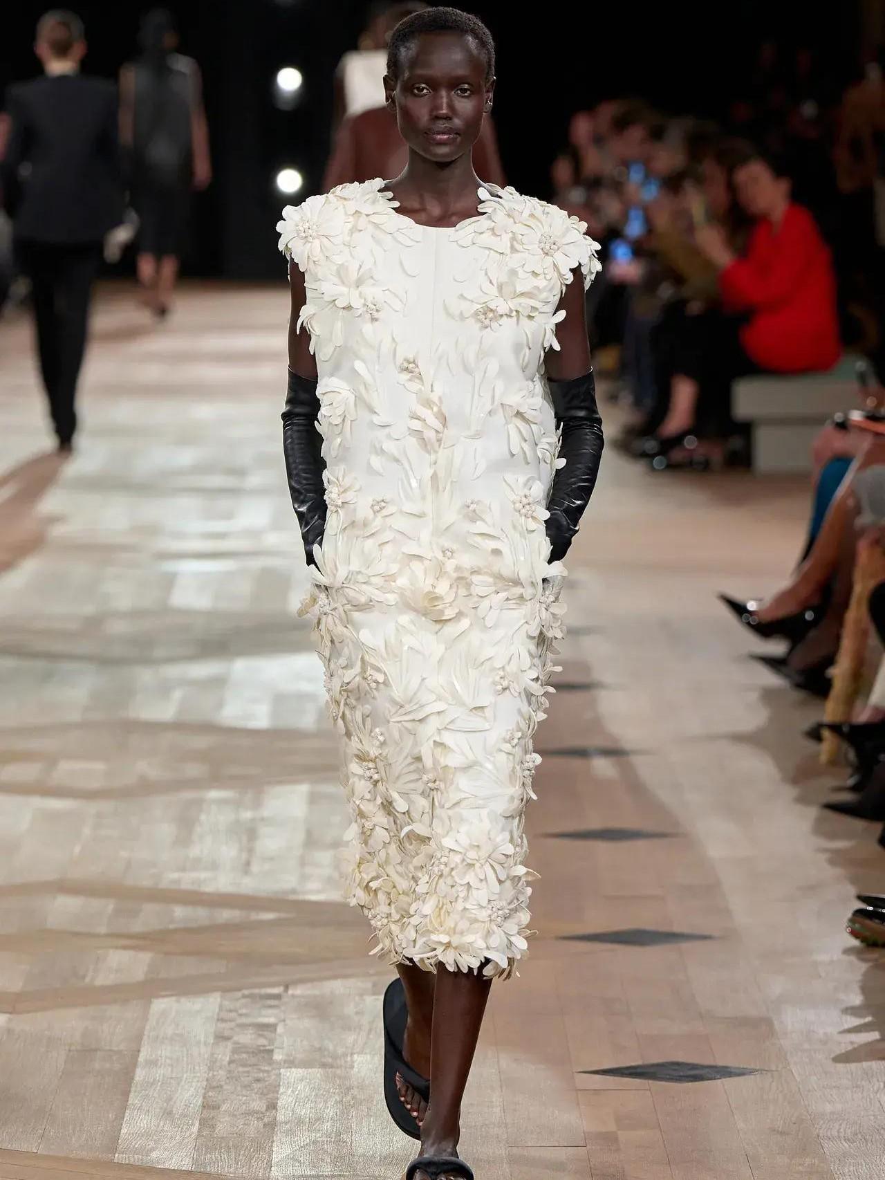 Первый образ — дань уважения к этому самому «мешку» — длинное вечернее платье с V-образным вырезом, свободное от лифов, белые оперные перчатки и огромные солнцезащитные очки с необычным украшением на голове. Этим аксессуаром Пиччоли отметил незаменимый вклад Демны в бренд и его склонности к экспериментам. «Было бы глупо отрицать, что здесь уже были Демна, Николя Гескьер и Кристобаль», — рассказывал Пьерпаоло.