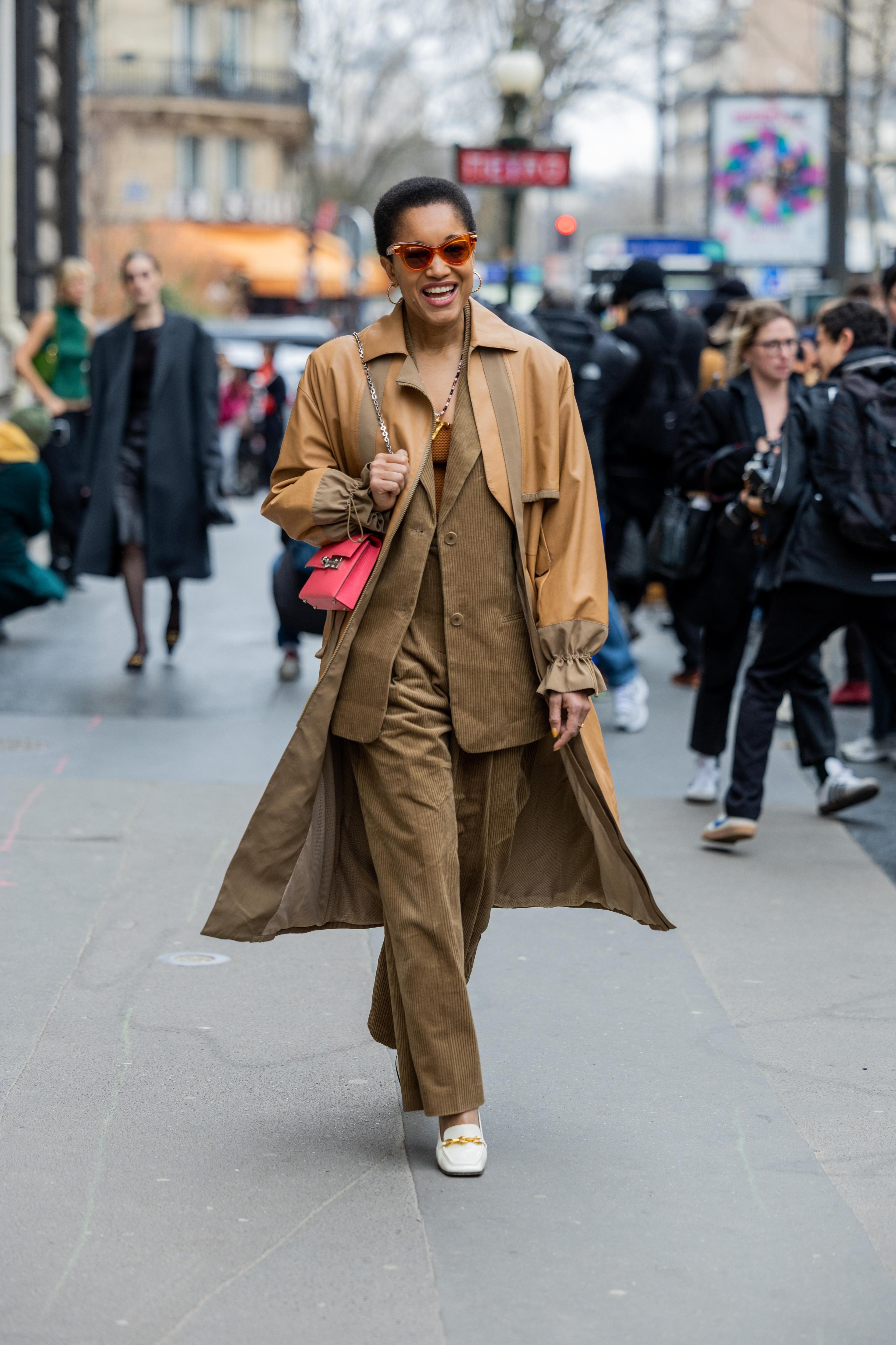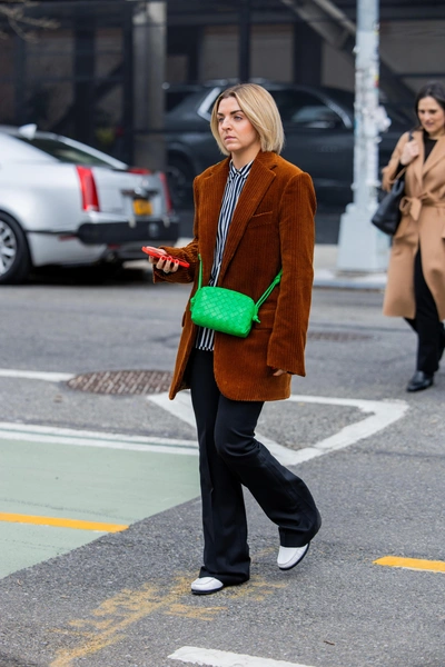 В копилку монохромных образов: еще одна интересная идея со стритстайла — однотонный вельветовый костюм. Вариант с пиджаком и брюками дополняем рубашкой для похода в офис или поло для прогулки; комбинацию юбки и пиджака носим с лодочками для Prada-настроения, или кроссовками для mix & match.