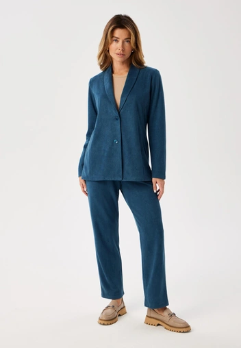 Образами из тотал-джинсы сейчас пестрят подиумы, так что назовем этот материал таким же популярным, как и замша. Но тренды-трендами, а не всем хочется облачаться в джинсовую ткань. Есть вариант — заменить ее на такую же голубую, только вельветовую. И тут потертости на ткани только станут плюсом и приблизят вельвет к виду джинсы.