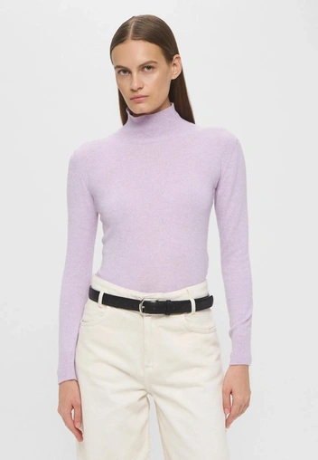 Такой дуэт идеально смотрится в многослойности: лиловая водолазка под фиолетовый жакет, градиентное платье — от темного к светлому, комплект из трикотажного свитера и юбки в близких, но не идентичных оттенках.