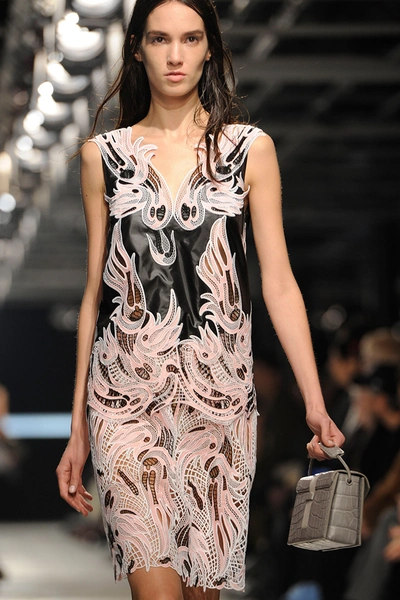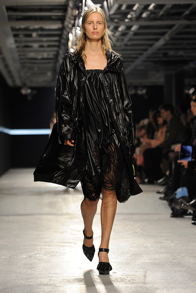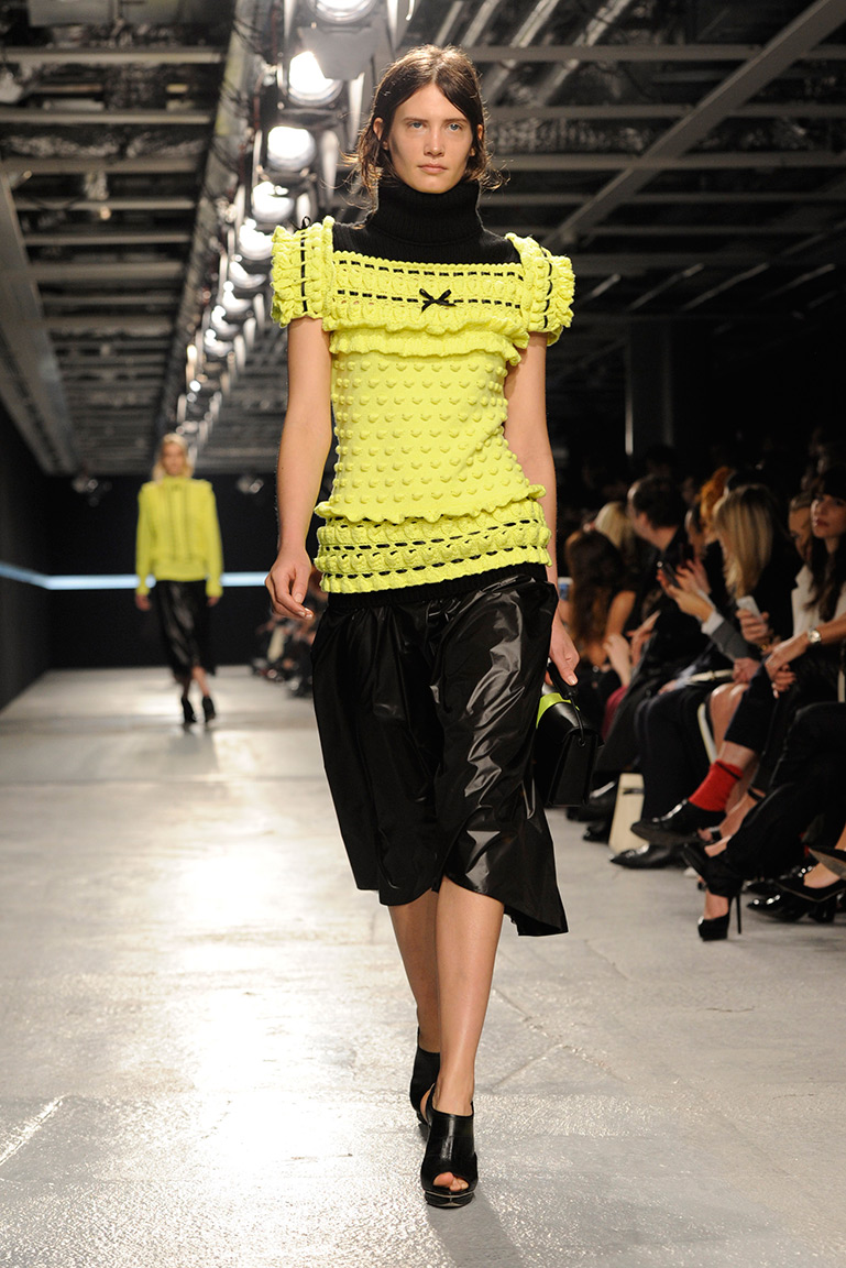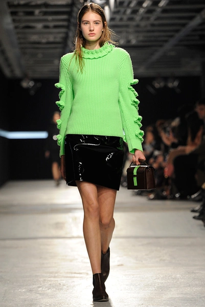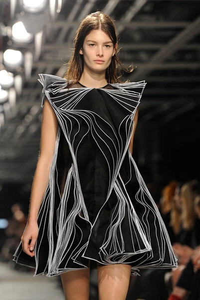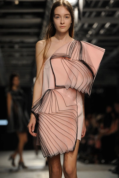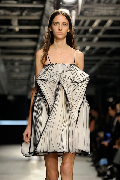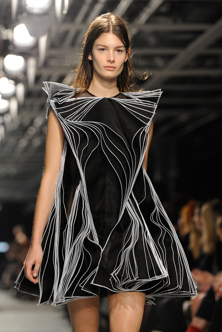 Элементы оригами сначала прослеживаются в узорных рукавах на черных туниках, а затем становятся основными деталями блузок и нежных розовых и белых платьев из органзы, которые выглядят легкими, но при этом многослойными. При каждом шаге модели они движутся вместе с ней, словно живые, слегка напоминающие тропических бабочек. Еще один главный элемент – кружево, выполненное даже из шерстяных тканей на свитерах. Новинкой на подиуме стали сумки, украшенные неоновыми полосами.