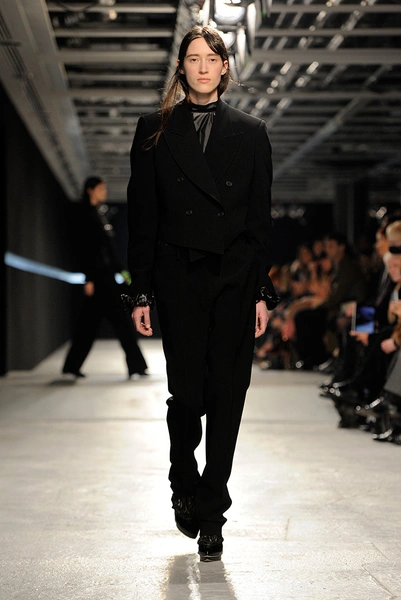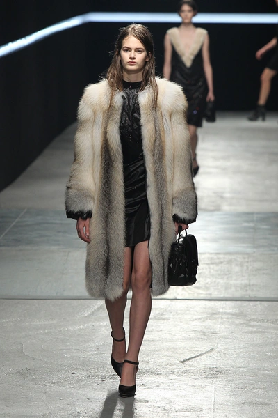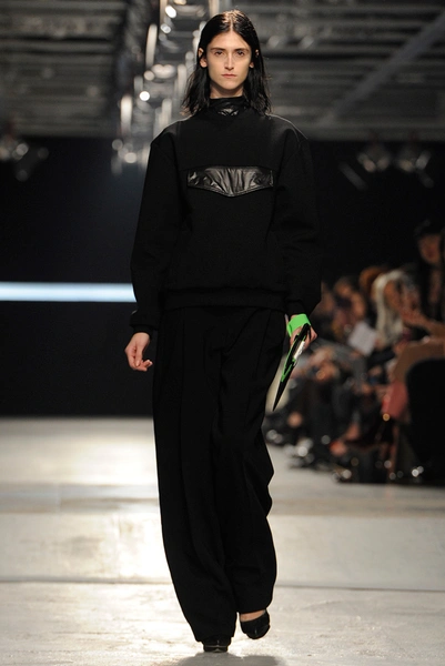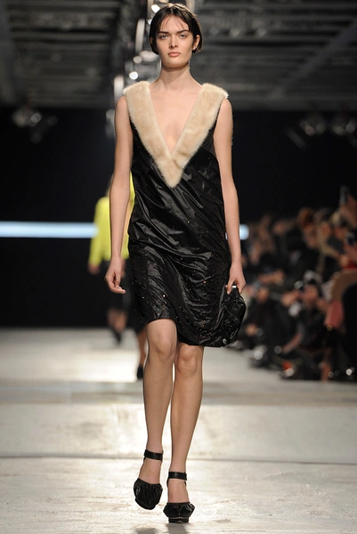 Показ дизайнера стартовал с геометрически скроенной одежды черного цвета – двубортных пиджаков и пальто с заостренными плечами, позже на подиуме появились стеганые черные жилеты, которые сменились темными платьями с пайетками. По линии декольте они декорированы мехом, но не таким пушистым и ярким, как в показе Matthew Williamson. Следом за ними пришел и цвет в виде мятных, серых, желтых и кремовых блузок, юбок и платьев. Цветочная весенне-летняя тема в осенней коллекции выражена не так ярко, в виде отпечатанных принтов.